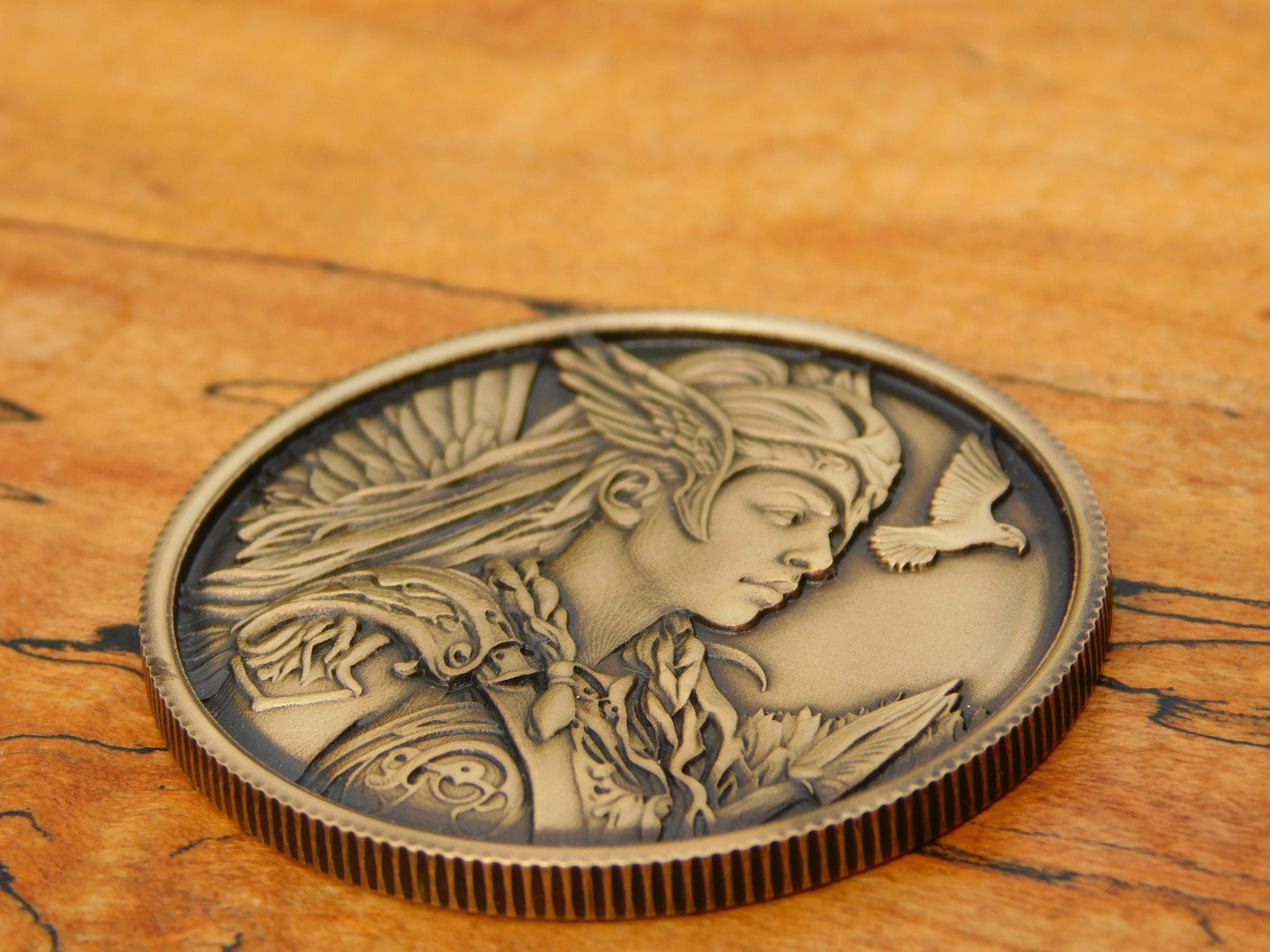 Brass coin featuring a 3D engraved Warrior Demon with the reverse showing a Valkyrie Angel