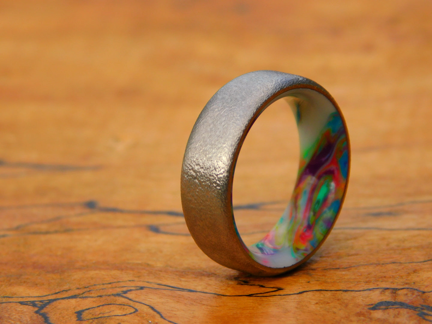 Brushed Titanium with a Neon Pastel Resin liner made to a size 7.5 at 7mm wide available and ready to ship!