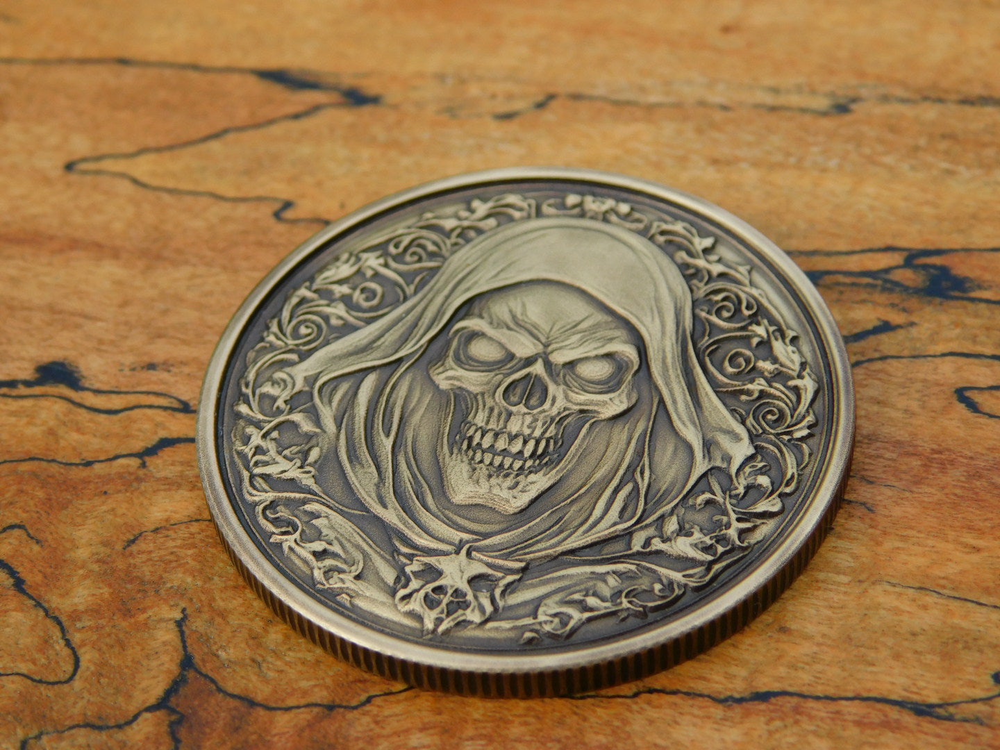 Brass coin featuring a 3D engraved Reaper with the reverse showing an Hourglass